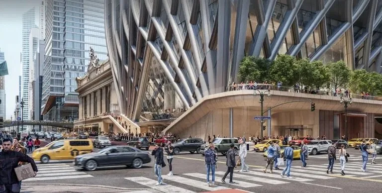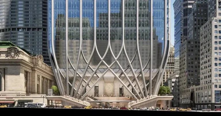 According to SOM, the tower’s design will respond to the mix of nearby New York City landmarks and architectural styles, ranging from Romanesque Revival to Art Deco, channeling the ethos of those aesthetics while establishing its own identity. Renderings show a striking crown of interlaced steel inspired by the Chrysler and Socony-Mobil buildings, two of its most prominent neighbors.