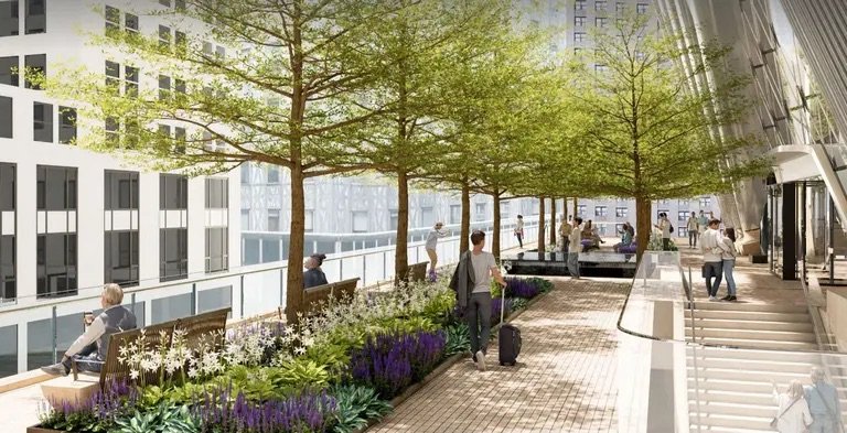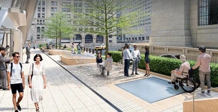 The Chrysler Terrace would feature a reflecting pool, plantings, and public seating, with retail space below. Notably, the Grand Central terrace would allow travelers to stand alongside the east facade of the terminal for the first time, according to a January presentation to the Public Design Commission (PDC).